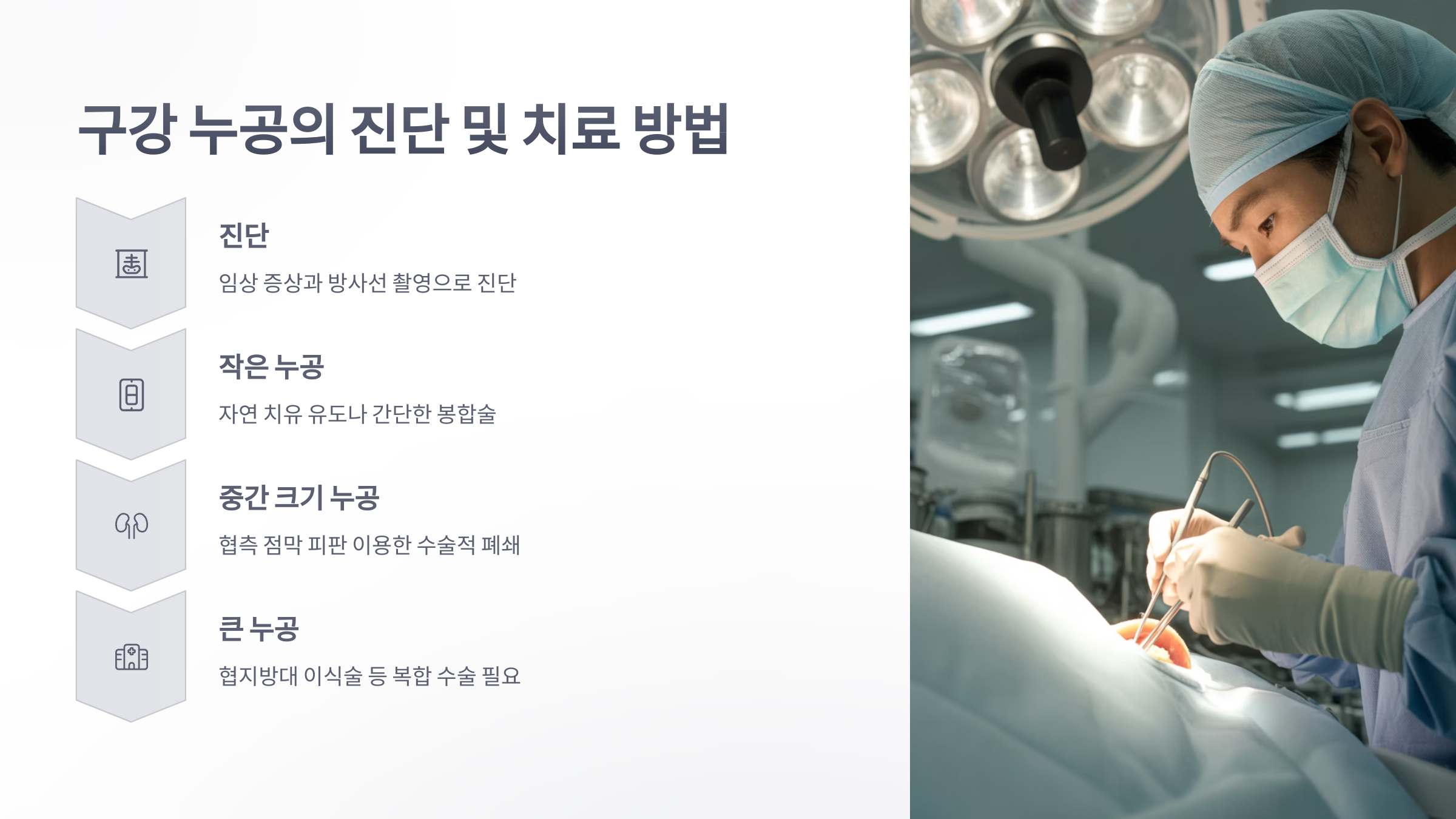 작은 크기의 구강 누공은 자연 치유가 가능하지만, 대부분의 경우에는 수술적 치료가 필요합니다. 정확한 진단을 통해 적절한 치료를 받는 것이 중요합니다.