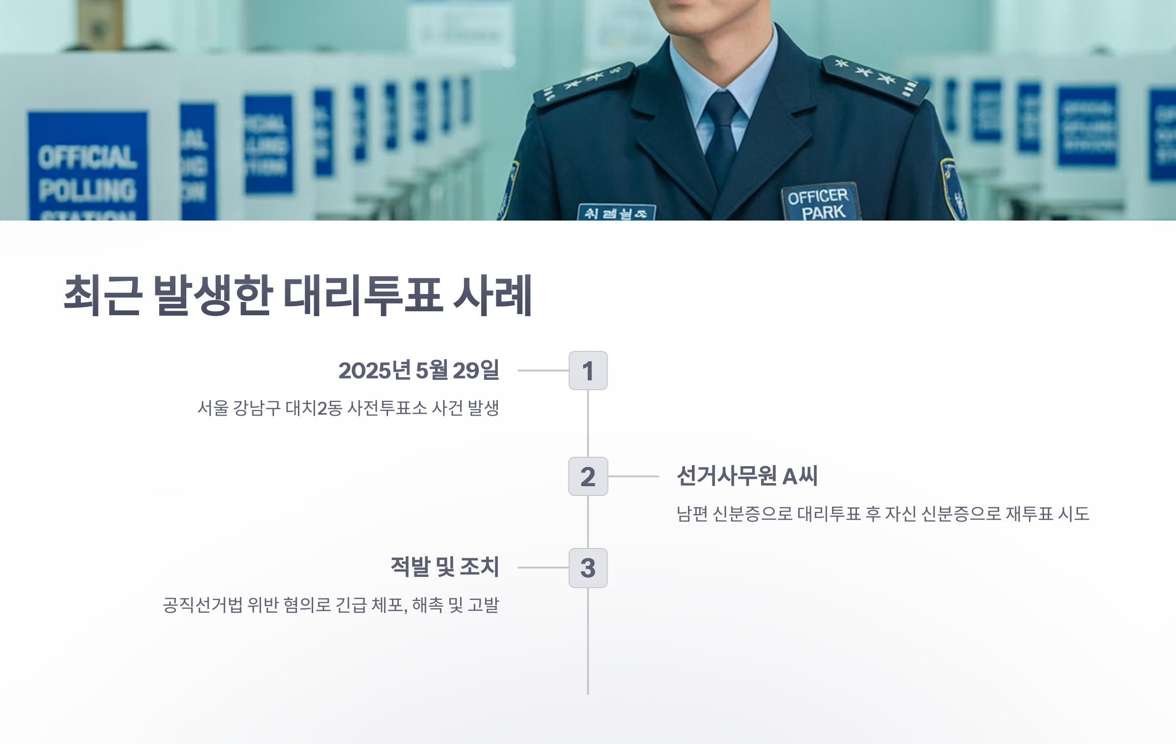2025년 5월 29일, 서울 강남구 대치2동 사전투표소에서 선거사무원으로 근무하던 a씨가 남편의 신분증을 이용해 대리투표를 한 후, 자신의 신분증으로 다시 투표를 시도하다가 적발되었습니다. a씨는 유권자 신원 확인 업무를 담당하고 있었으며, 경찰에 의해 공직선거법 위반 혐의로 긴급 체포되었습니다. 중앙선거관리위원회는 a씨를 해촉하고 고발 조치하였으며, 남편에 대해서도 공모 여부를 수사 의뢰하였습니다.