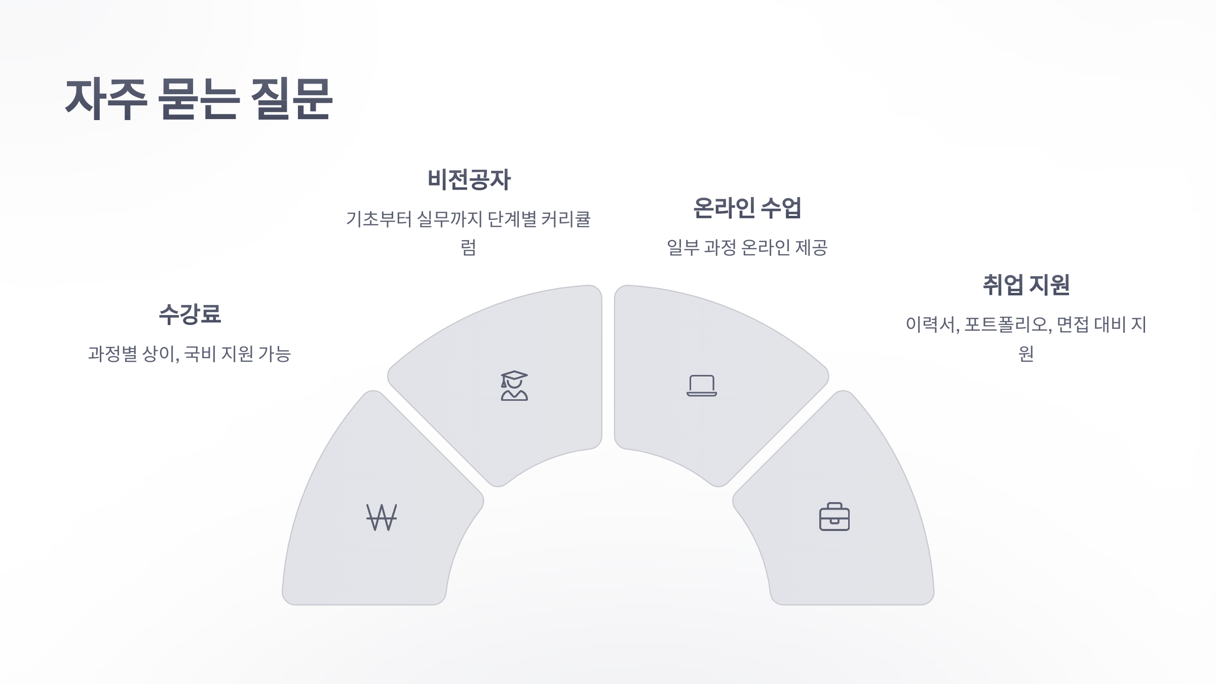 수강료는 과정에 따라 다르며, 국비 지원 프로그램을 통해 일부 또는 전액 지원받을 수 있습니다. 자세한 수강료는 공식 홈페이지에서 확인하시거나 상담을 통해 문의하시기 바랍니다.