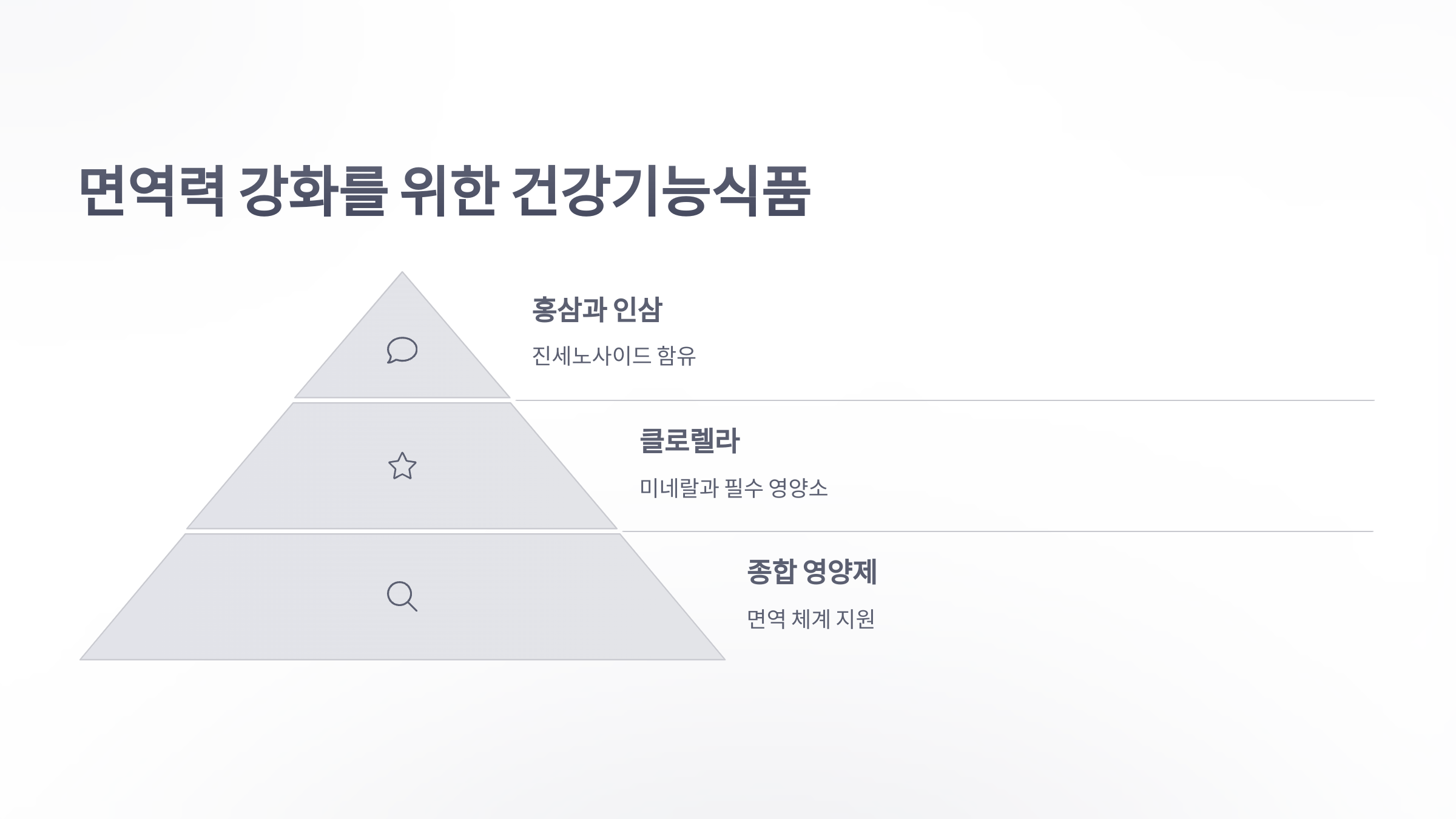 홍삼과 인삼에 함유된 사포닌 성분인 진세노사이드는 면역 세포의 활성도를 높여 면역력을 강화하는 데 도움이 됩니다. 또한, 클로렐라는 다양한 미네랄과 필수 영양소를 함유하고 있어 면역력 증진에 효과적입니다.