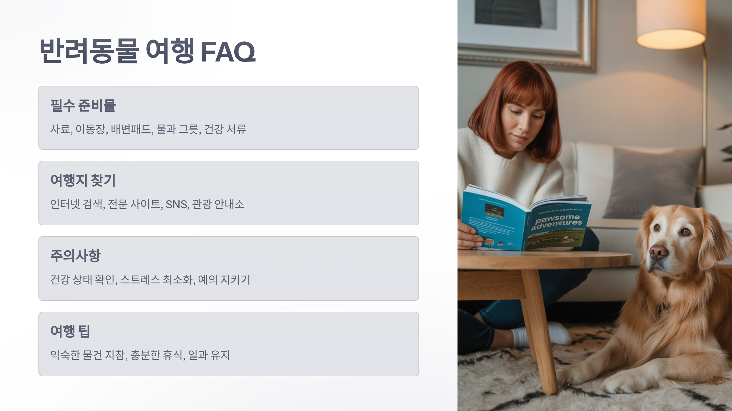 - 주변 환경 파악: 여행지의 반려동물 관련 규정을 숙지하세요.