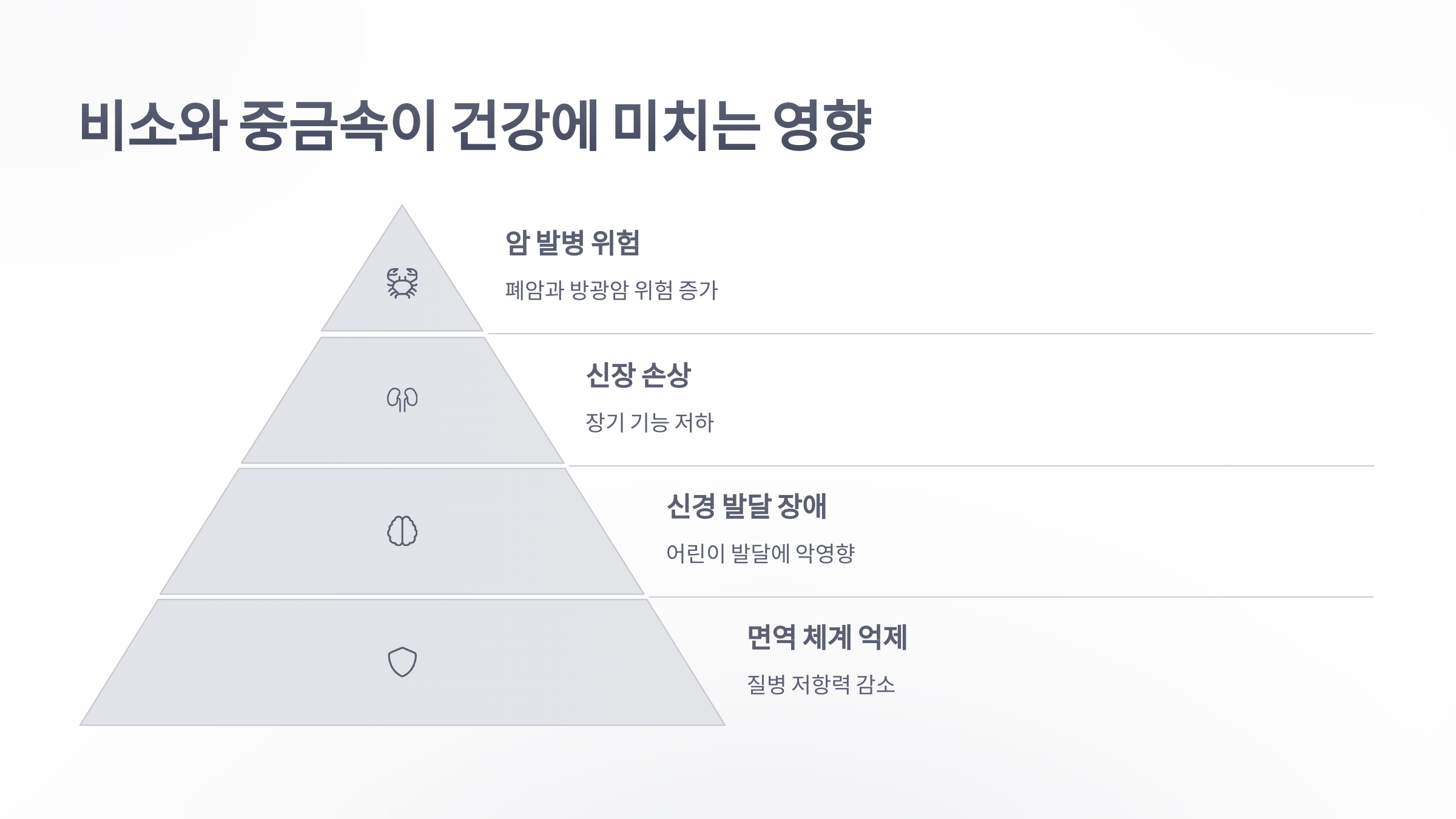 비소는 장기간 섭취 시 신경 발달 장애, 면역 체계 억제, 신장 손상, 폐암 및 방광암 등의 건강 문제를 유발할 수 있습니다. 특히 어린이와 임산부는 이러한 위험에 더욱 민감합니다.