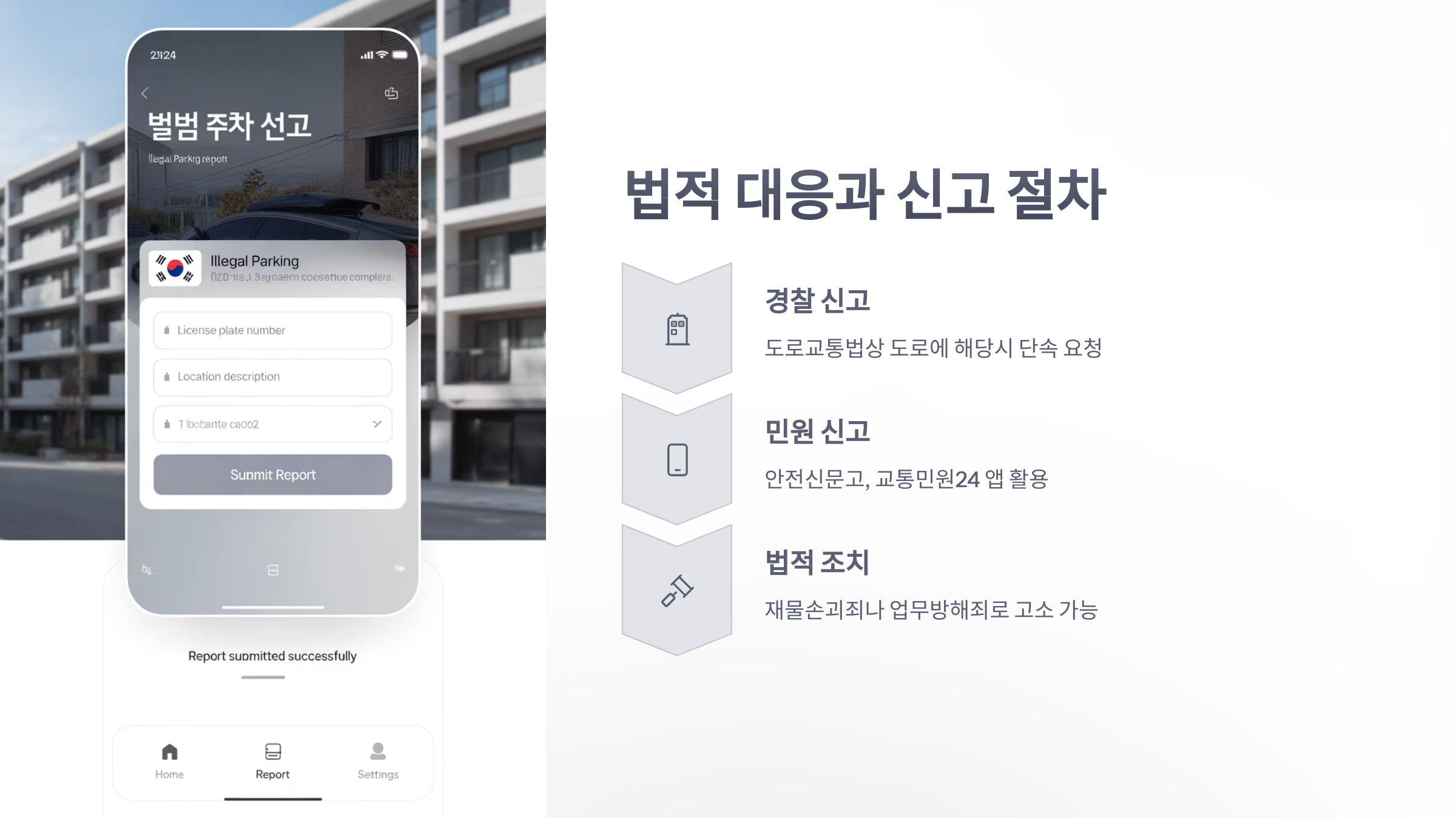 - 민원 신고: '안전신문고'나 '교통민원24' 앱을 통해 불법 주차를 신고할 수 있습니다. 사진과 위치 정보를 함께 제출하면 효과적입니다.