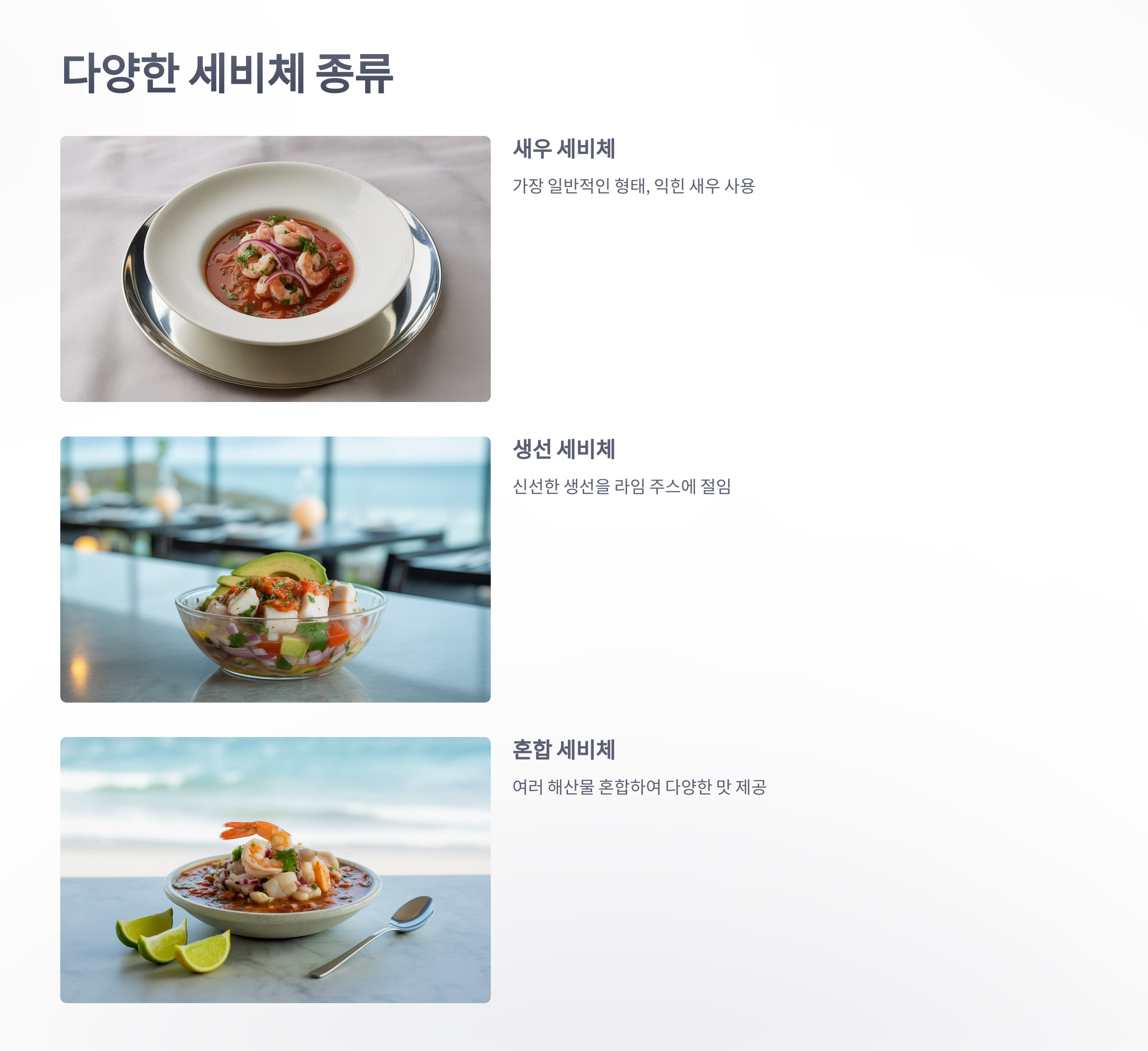 - 혼합 세비체: 여러 종류의 해산물을 혼합하여 다양한 맛을 즐길 수 있습니다.
