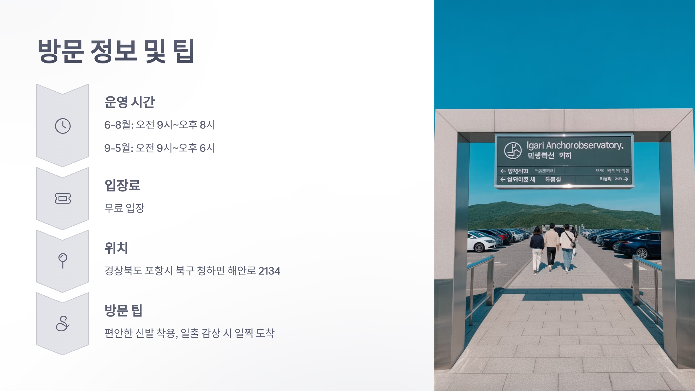 전망대는 연중무휴로 운영되며, 운영시간은 계절에 따라 다릅니다. 6월부터 8월까지는 오전 9시부터 오후 8시까지, 9월부터 5월까지는 오전 9시부터 오후 6시까지 운영됩니다. 입장료는 무료이며, 주소는 경상북도 포항시 북구 청하면 해안로 2134입니다. 방문 시에는 편안한 신발을 착용하고, 일출을 감상하려면 일찍 도착하는 것이 좋습니다.