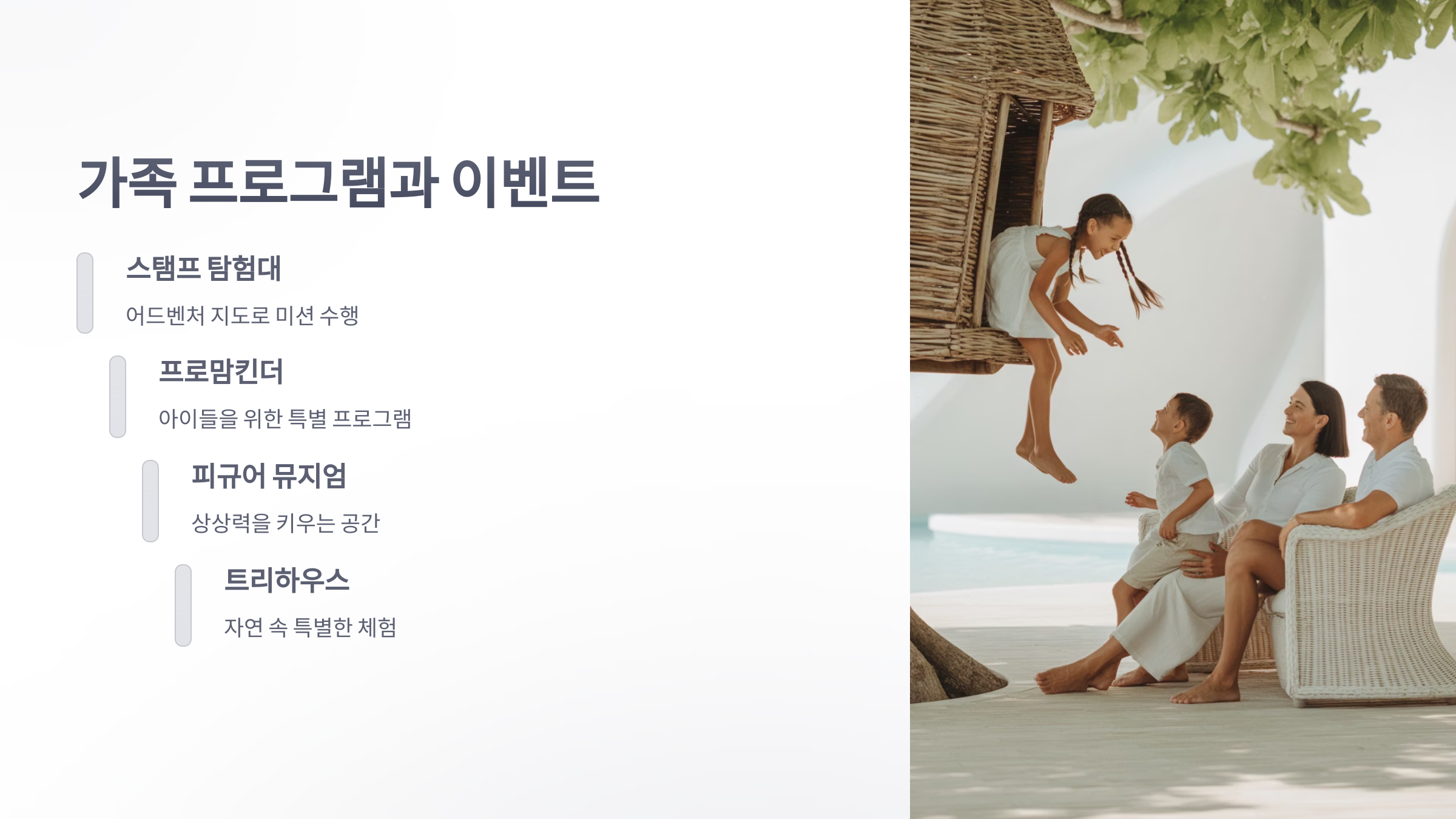 가족 단위 고객을 위한 다양한 프로그램과 이벤트도 마련되어 있습니다. '스탬프 탐험대: 힐링 포레스트'는 체크인 시 받은 어드벤처 지도를 통해 미션을 수행하고 경품을 받을 수 있는 이벤트입니다.또한, 아이들을 위한 '프로맘킨더' 프로그램과 피규어 뮤지엄, 트리하우스 등은 자연 속에서 상상력을 키울 수 있는 공간을 제공합니다.