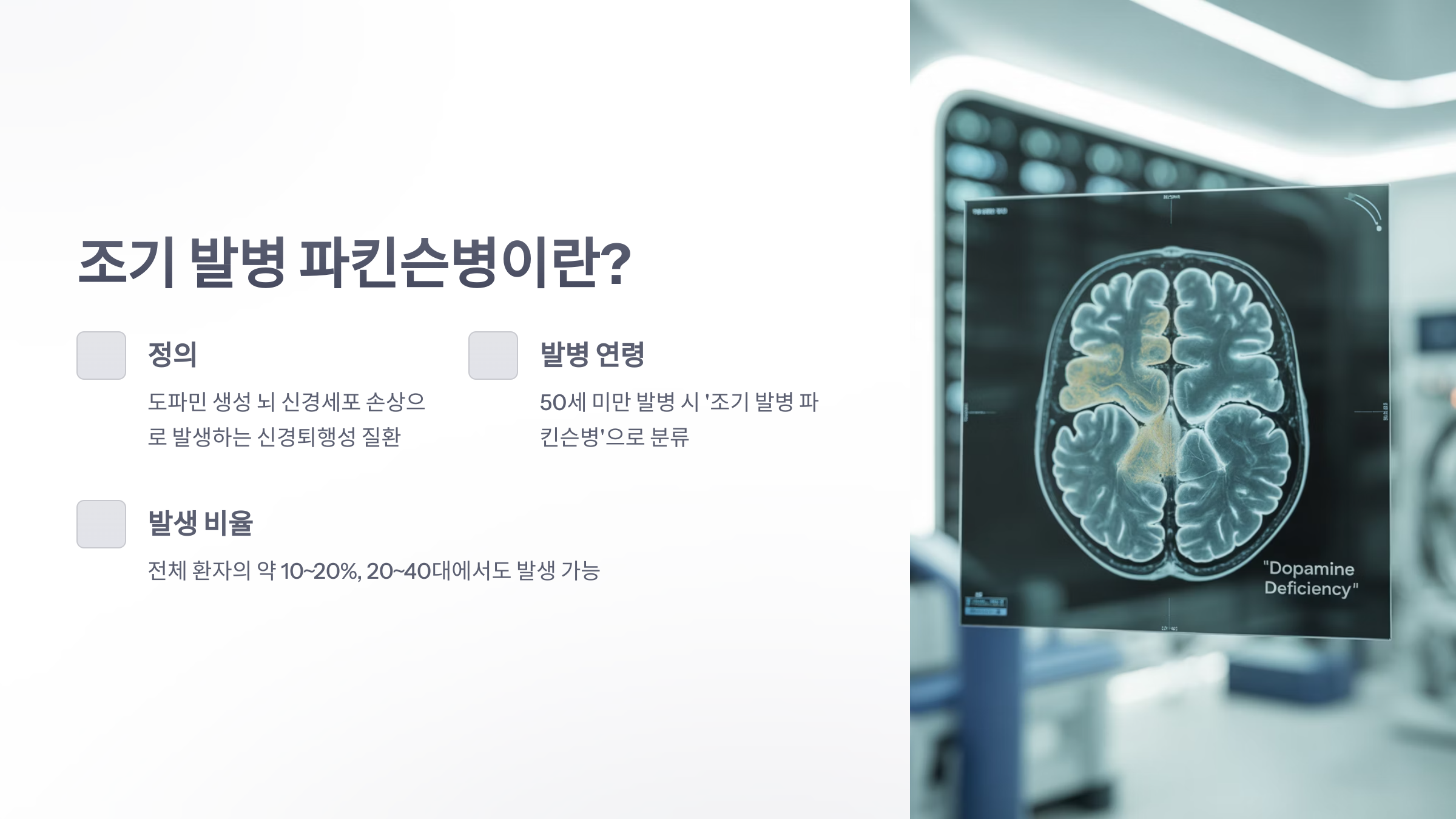 파킨슨병은 도파민을 생성하는 뇌의 신경세포가 손상되면서 발생하는 신경퇴행성 질환이에요. 일반적으로 60대 이상에서 많이 발병하지만, 50세 미만에 나타나는 경우를 ‘조기 발병 파킨슨병(young-onset parkinson’s disease)’이라 부릅니다. 전체 환자의 약 10~20%가 여기에 해당하며, 20~40대에서도 드물지만 발생할 수 있습니다.