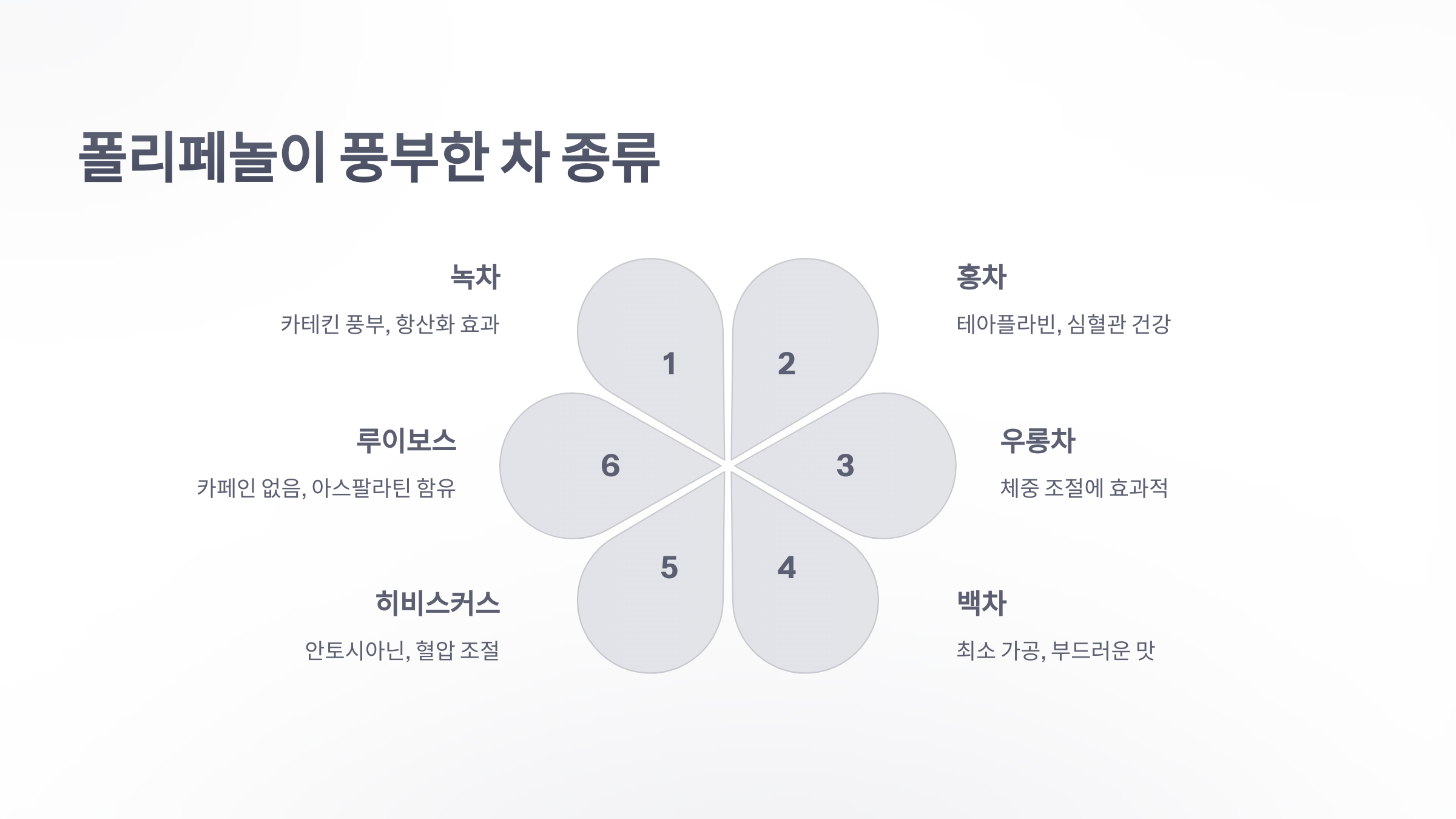 - 백차: 최소한의 가공으로 폴리페놀 함량이 높으며, 부드러운 맛이 특징입니다.