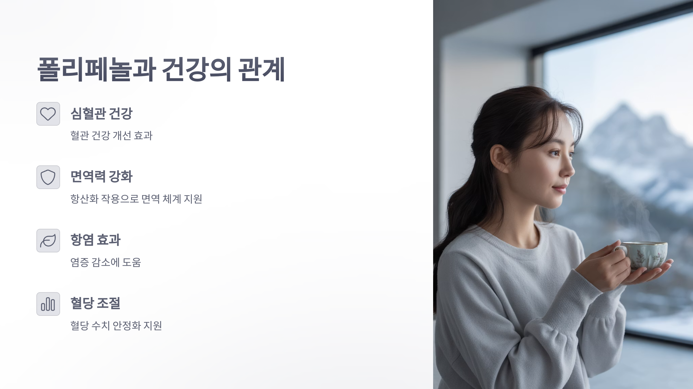 일상에서 다양한 차를 즐기며 건강을 챙기는 습관을 들이고 있습니다. 특히 폴리페놀이 풍부한 차는 몸과 마음에 활력을 주는 데 큰 도움이 되었습니다.