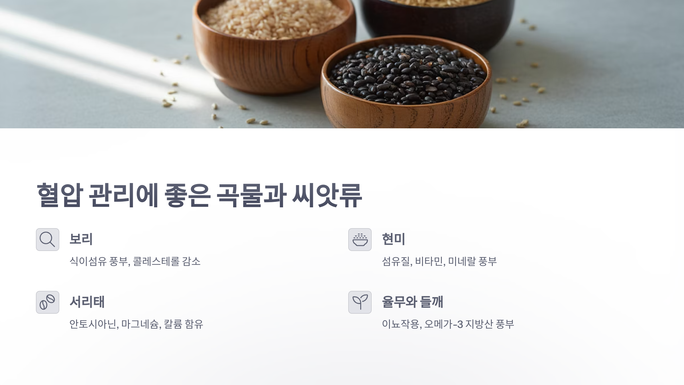 곡물과 씨앗류는 혈압 조절에 중요한 역할을 합니다. 🌾